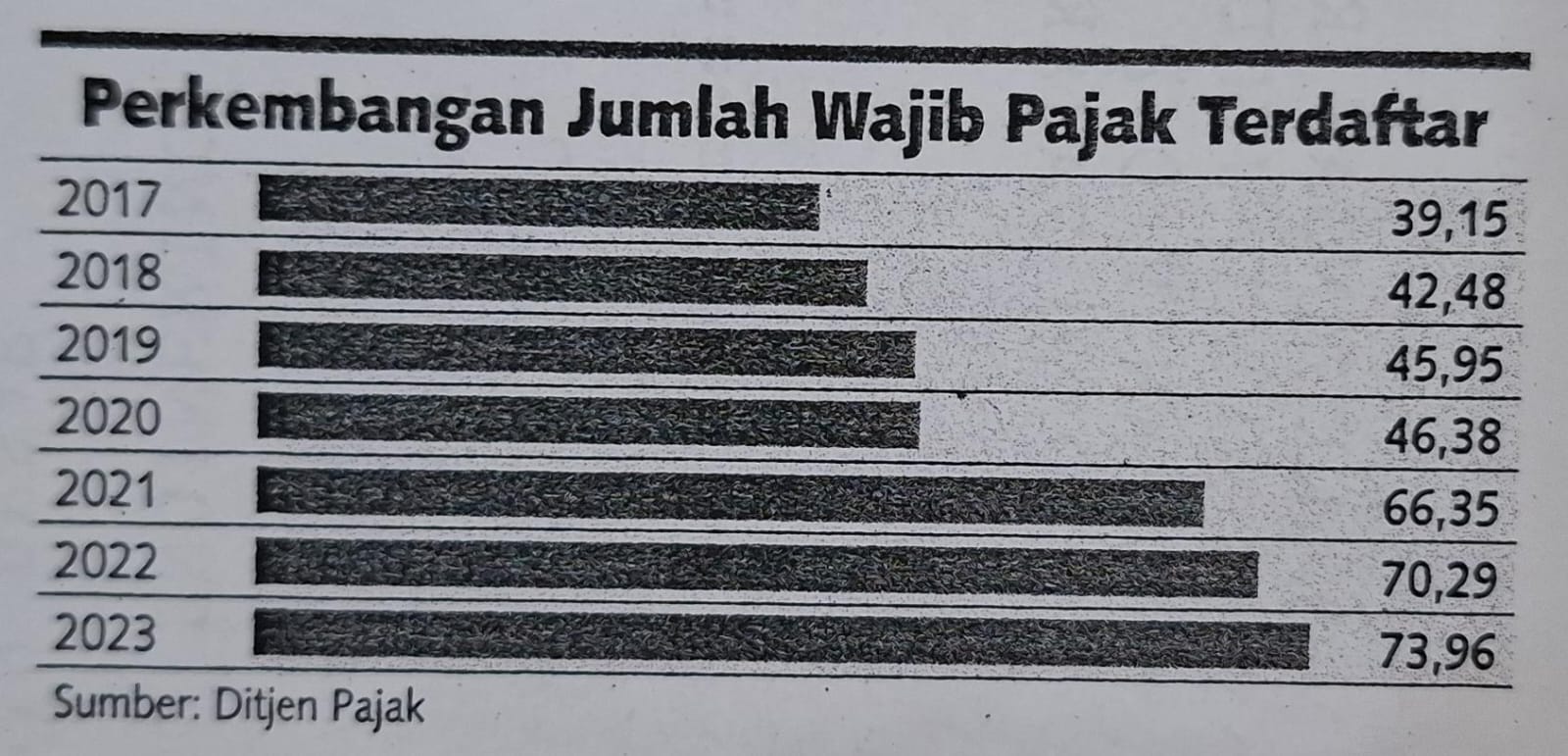 Sedang tahun 2023, eksten sifikasi menghasilkan penambahan 73.631 wajib pajak baru. Meski lebih tinggi dibanding tahun sebelumnya, tapi jumlah itu belum mampu menyamai level 2017 hingga 2020. Malah 2024, penambahan wajib pajak baru hanya 72.640, turun dari tahun sebelumnya.