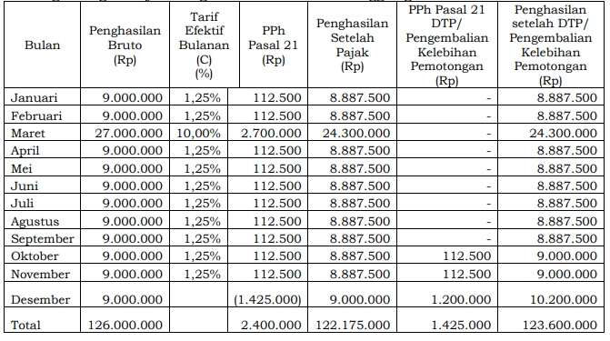 Adapun pada masa pajak Desember 2025 diketahui terdapat kelebihan pemotongan PPh Pasal 21 senilai Rp1.425.000. Dalam kasus ini, kelebihan pemotongan PPh Pasal 21 senilai Rp1.425.000 tidak dikembalikan seluruhnya kepada Tuan H.