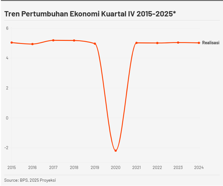 Dalam catatan Bisnis, selama 10 tahun terakhir, pertumbuhan ekonomi kuartal IV/2025 tidak pernah mencapai angka 5,5%. Apalagi dengan kondisi ekonomi 2025, yang selain ditopang dukungan dari stimulus pemerintah, nyaris tidak ada momentum politik atau ekonomi dalam skala besar yang bisa membawa ekonomi Indonesia tumbuh 5,5% pada kuartal IV/2025.
