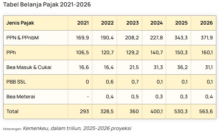 Sementara itu, belanja perpajakan untuk Pajak Penghasilan (PPh) pada RAPBN 2026 diproyeksikan sebesar Rp160,1 triliun atau lebih besar dari 2025 yakni Rp150,3 triliun. Kemudian, untuk bea masuk dan cukai diproyeksikan Rp31,1 triliun atau lebih kecil dari tahun sebelumnya yakni Rp36,2 triliun. Sedangkan, PBB P5L diproyeksikan pada 2026 sebesar Rp0,1 triliun atau hampir sama dengan tahun sebelumnya.