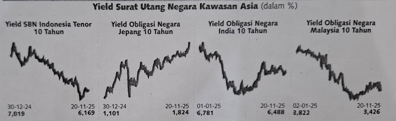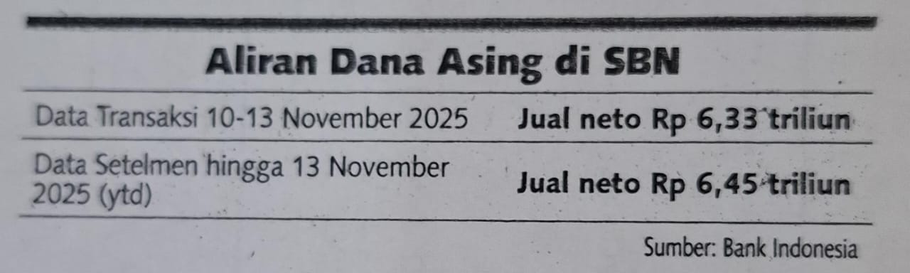 Arus modal asing deras keluar dari pasar surat berharga negara (SBN). Bank Indonesia (BI) mencatat, pada periode 10-13 November 2025, asing jual neto sebesar Rp 6,33 triliun di pasar SBN. Jumlah ini lebih besar dari jual neto sepekan sebelumnya sebesar Rp 2,69 triliun. Sejak awal tahun (ytd), dana asing tercatat jual neto sebesar Rp 6,45 triliun di pasar SBN.