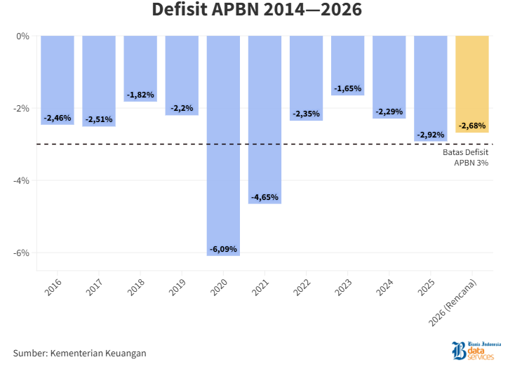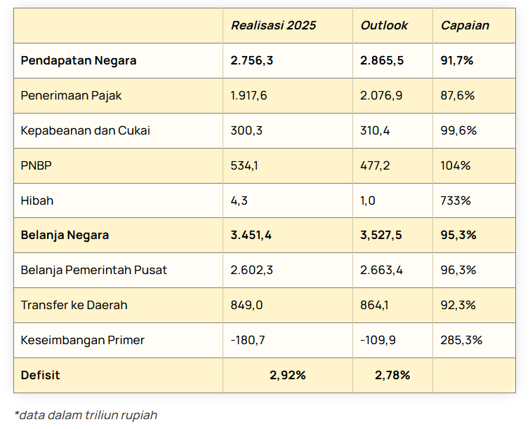 Defisit APBN 2025 terjadi sesuai perkiraan Purbaya, sebelumnya dia telah memberikan sinyal kuat bahwa realisasi defisit akan melebihi target outlook sebesar 2,78% terhadap PDB. Biang keladinya, pendapatan negara meleset dari proyeksi, sementara belanja harus dijalankan.